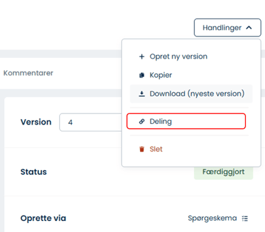 Med Public Links i ComplyCloud kan du dele dokumenter eksternt. Når du aktiverer et Public Link for et dokument, får du en unik URL, som kan deles med eksterne parter eller på hjemmesiden. Dette gøres ved at gå til det pågældende dokument efterfulgt af Handlinger > Deling