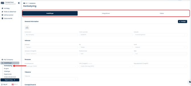 Som administrator kan du tilpasse opsætningen af jeres ComplyCloud-konto ved at gå til Indstillinger > Kontostyring