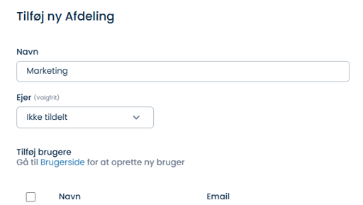 - Navngiv afdelingen, tilføj en afdelingsejer samt brugere