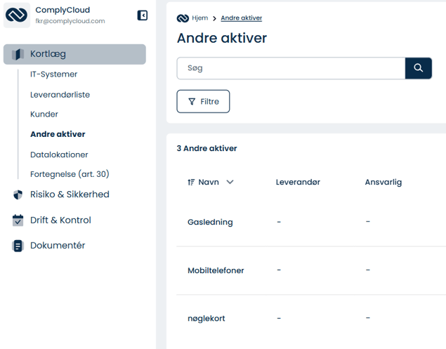 Er du ISMS-kunde, har du adgang til sektionen Andre aktiver, hvor du kan registrere fysiske aktiver: Kortlæg > Andre aktiver