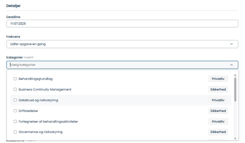 Når du opretter egne opgaver kan du bl.a. tilvælge en konkret kategori, som opgaven skal tilhører. Det er en god idé at tilføje en kategori, da du dermed sikrer dig, at opgaven vises under Dashboardets kategorier og at opgaven vises i Årshjulet: