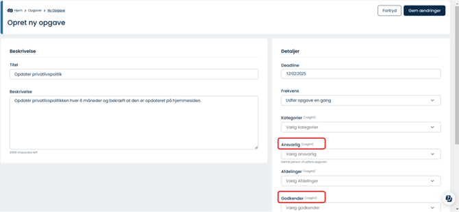Udfyld som minimum følgende felter for at oprette opgaven: