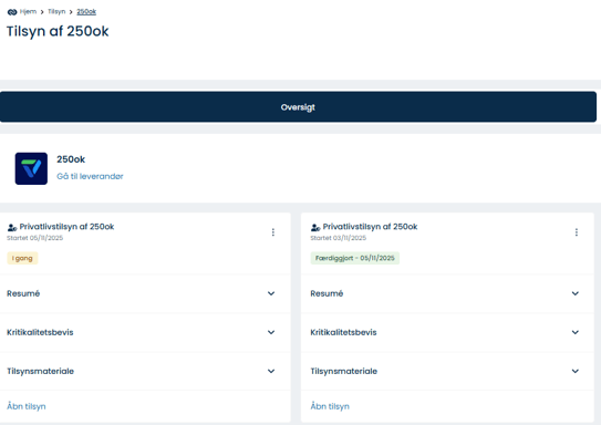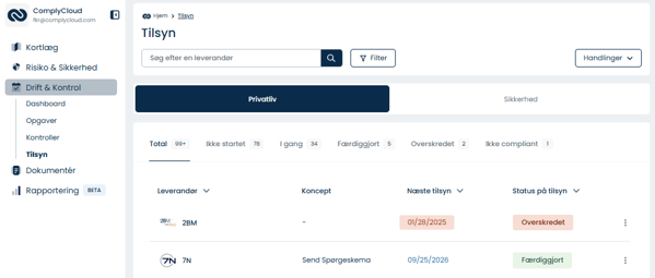 Kom igang ved at navigér til Drift & Kontrol > Tilsyn. Her får du et samlet overblik over alle leverandører og deres tilsyns-status.