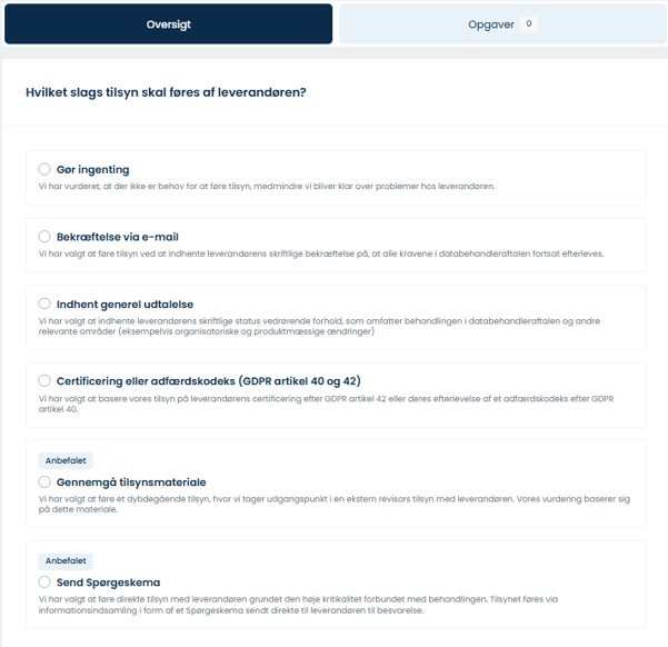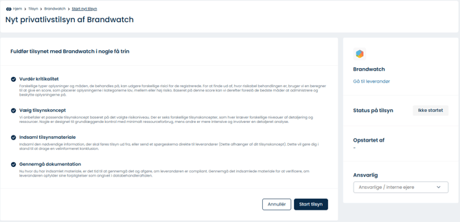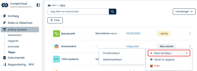 Vælg en leverandør fra oversigten > klik på de tre prikker > Start tilsyn > vælg 'privatlivstilsyn' eller 'sikkerhedstilsyn'