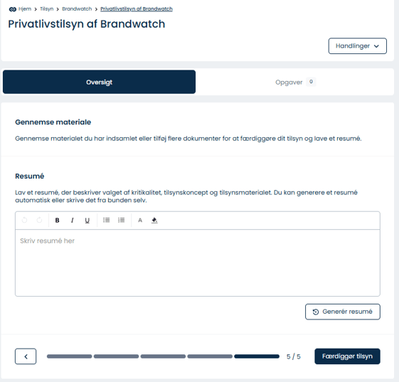 Her færdiggøres og beskrives tilsynets fremgangsmetode. Benyt knappen Generér resumé og lad ComplyCloud's AI beskrive tilsynet baseret på dine tidligere valg.