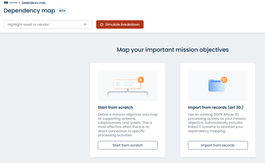 If this is your first time using the Dependency Map, you can choose either to start from scratch or import processes from your Record of Processing Activities as a baseline.