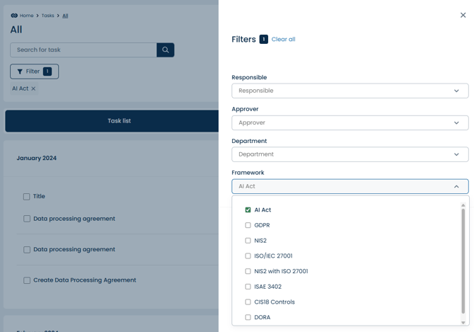 3. Filter. Then select AI Act from the Framework menu.