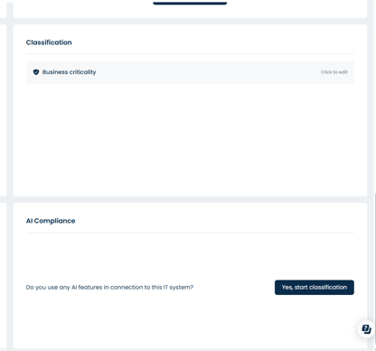 By accessing the selected IT system, you now have access to a feature that allows you to classify your IT systems against the AI Act — scroll to the bottom and click “Yes, start assessment.”