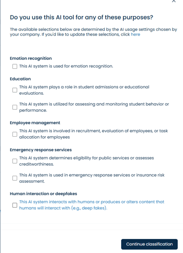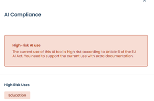Tip: It's a good idea to use the Risk Module to document how you ensure compliance for AI systems marked as, for example, High Risk based on the above classification. The classification can serve as a way to prioritize which systems should undergo risk assessment first.