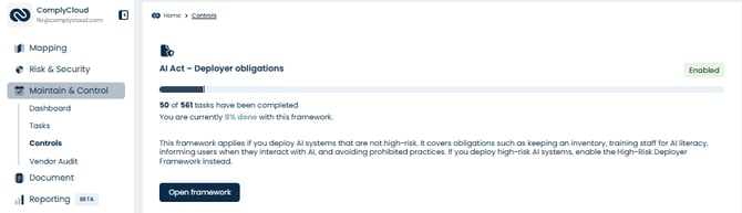 If you later classify your AI usage or development as high-risk, you will automatically receive a task prompting you to activate one of the two high-risk frameworks