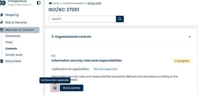 - To opt out of a control and start your SoA, choose Archive as Non-Applicable from the chosen control