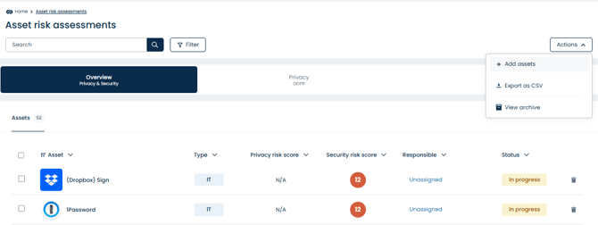 Once you’ve added an IT system or a processing activity under Mapping, you can create a risk assessment under Risk Assessment of Assets by clicking Actions > Add Assets.