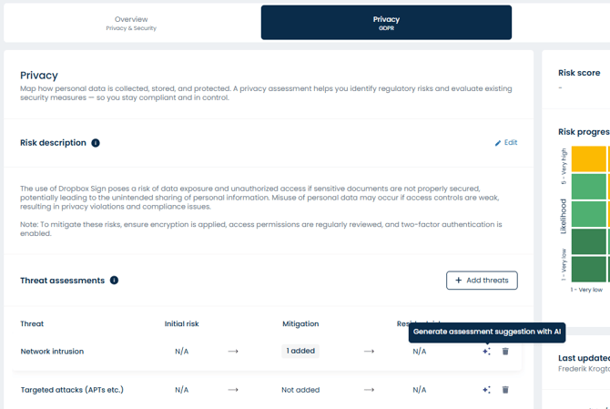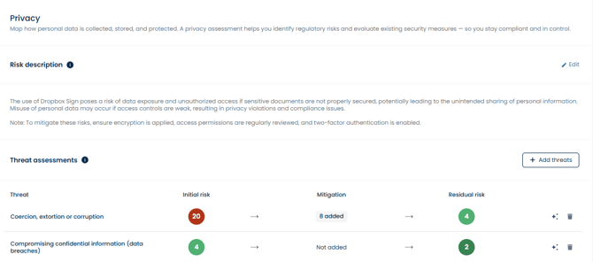For each of your assets, you can add all the threats you consider relevant by clicking Add threats. Here, you should assign risk scores, add security measures, and define a residual risk for each of the selected threat.
