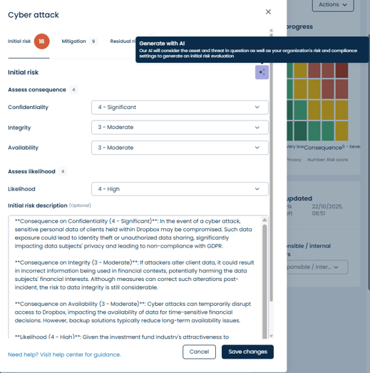 Note: The AI feature can help you create your risk assessments faster. While it can save time, we recommend using the AI suggestions with caution and always reviewing them before applying them in your risk assessments.