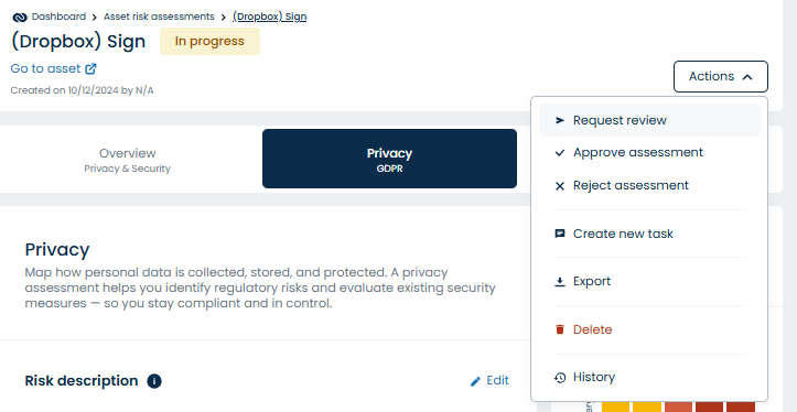 You can benefit from sending a risk assessment for review. Once approved, the risk assessment is saved as a new version under History.
